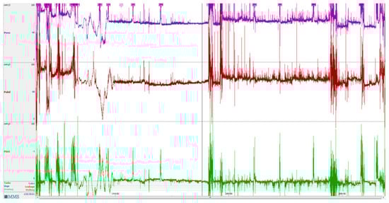 Figure 9 shows a curve during cystometry with all three parameters. In clinical practice, abdominal pressure is often recorded from the rectum. This is part of the gastrointestinal system, and in itself, a contractile organ. In many cases, this will cause significant artefacts in the determination of detrusor pressure. There are several devices on the market for ambulatory cystometry. According to our experience at the clinic, there are important limitations with this equipment when connected to water-filled lines. As shown in Figure 9 the cystometry curve is difficult to interpret, even in an expanded graph, due to movement artefacts. This illustrates the fact that physiological characteristics of the target organ are not recorded, but the patient’s activities are.