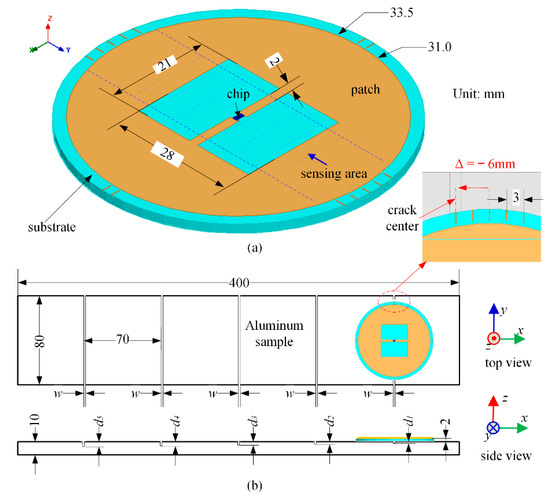 In general, the crack position may be hard to be predicted. The variation of sensitivity with crack position will affect the reliability of crack characterization. Therefore, the linearity in the sensing area is of paramount importance for robust crack monitoring. In this paper, a circular patch is used as a radiator. A rectangular window is opened in the center of the patch to increase the sensitivity when crack grows as well as to improve the robustness with respect to crack position. Meanwhile, the antenna sensor is designed for conjugate impedance matching to the tag chip of NXP UCODE G2iM+, the input impedance and typical read sensitivity of which are 21.2 − j199.7 Ω and −17.6 dBm at 915 MHz, respectively. The geometry of the antenna sensor used in this paper is similar with [28]. To reduce the cost, the material of antenna substrate is Flame Retardant 4 (FR4), with a relative permittivity of 4.4, a loss tangent of 0.02 and a thickness of 2.0 mm. The conjugate impedance matching can be easily achieved by tuning the length and width of the rectangular window.