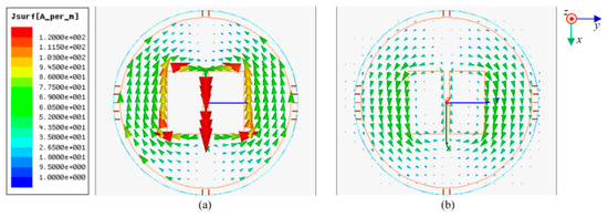 Simulated current distributions of the antenna sensor at 933 MHz on: (a) radiating patch and (b) metallic surface.
