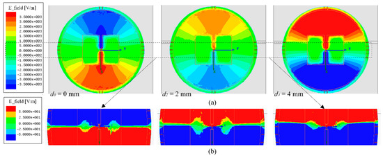 Simulated z-direction E-field of the antenna sensor at 920 MHz and Δ = −6 mm, where the field is extracted from the center of cavity formed by the circular patch and metallic surface: (a) full scale and (b) zoom in.
