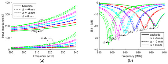 Simulated (a) input impedances and (b) reflection coefficients in the variations of crack depth and position, where solid line represents the backside reference when Δ = 0 mm.