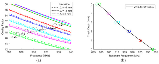 For a conductor-backed dipole array, it was found that 58.8% and 62.5% of the total electric and magnetic energies were stored between the array and the ground plane, respectively [32]. The quality factor of the antenna at a presence of metal with defect is displayed in Figure 5a. We can find that the quality factor decreases with an increase of crack depth. And also, the quality factor is slightly dependent on the relative position between crack and patch. It can be predicted that the antenna gain of the antenna will be slightly improved as crack increases. The resonant frequency is extracted from Figure 4b and used as a feature to characterize the crack. The results are shown in Figure 5b. The first order curve fitting technique is utilized to extract the relation between the feature and crack, which can be used to quantify the crack depth once the resonant frequency of the antenna sensor is obtained. We can see that a 1-MHz decrease in the resonant frequency from the healthy state means a 0.14-mm increase in the crack depth.