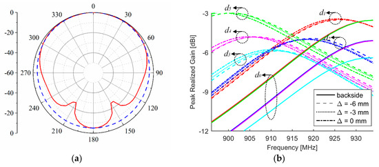 Simulated: (a) radiation pattern at the healthy state and 930 MHz, where solid line represents xz-plane and dash line represents yz-plane and (b) peak realized gain of the antenna versus frequency in the variations of crack depth and position, where solid line represents the backside reference when Δ = 0 mm.