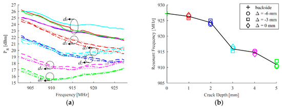 The measured threshold power to activate the tag in the variations of crack depth and position corresponding to Figure 6b: (a) where solid line represents the backside reference when Δ = 0 mm and dash line represents Δ = −6 mm, dot line represents Δ = −3 mm, dot dash line represents Δ = 0 mm with crack and (b) the corresponding features.