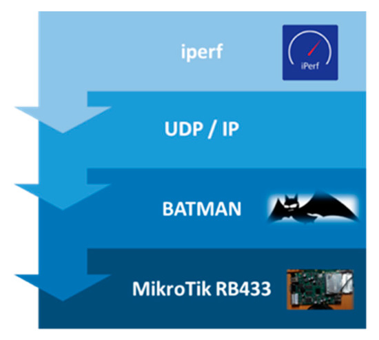 To provide and ensure VANET connectivity, we have selected the proactive distributed protocol BATMAN-ADV [33], which is the acronym of Better Approach To Mobile Adhoc Networking Advanced. It is a routing protocol for multi-hop mobile Adhoc networks that does not manage a centralized knowledge of the wireless network and does not need to consolidate information concerning network changes in every node in the network, since it does not try to determine the entire route at sending time. Each packet passing through each node of the network gets the next best jump at that time for its destination. Data is passed to the next neighbor at a given mac-address until it reaches its destination. We have placed the BATMAN-ADV protocol on each RB433 UAH device, and using iperf, we have analyzed communication flows between two static vehicles (V2V) and between a static vehicle and the infrastructure (V2I), as shown in Figure 3. Figure 6 shows the communication stack implemented for the experimental measurements. Network parameters obtained by the experimental measurements are presented in Section 5.