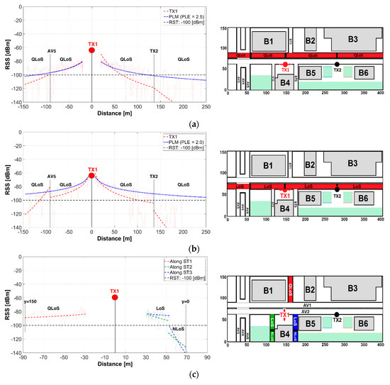 The TX1-RSS along AV1, AV2, ST1, ST2 and ST3 is depicted in Figure 7 while Table 3 summarizes the PLE and STD values along AV1, AV2, ST1, ST2 and ST3. Figure 7a illustrates the TX1-RSS along AV1 and its comparison with a Path Loss Model (PLM) [34]. This PLM describes the random shadowing effects over many measurements that have the same TX-RX separation, but different levels of clutter on the propagation path. The PLM received power , is defined by Equation (1):