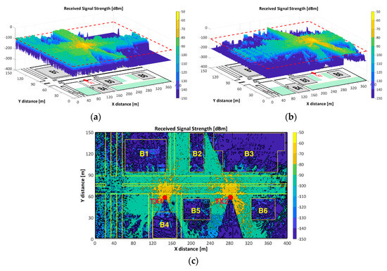 Figure 8 illustrates the RSS and coverage map of TX1 and TX2 at z-plane of 1.5m, the estimated RX antenna height of the passenger cars. Figure 8a,b show an RSS surf-plot of TX1 and TX2 respectively. Areas such as the roundabout, AV3, AV4, AV5 and the lower-area of ST2 and ST3 have RSS values below the RST. The dispersive effect caused by the trees, is not clearly defined in this view. Figure 8c depicts the jointly TX1 and TX2 contour-plot where RSS values above the RST are observed along AV1, AV2, ST1 and upper sector of ST2 and ST3 making feasible the V2I communication. The blocking of the signal due to the buildings is notorious (e.g., the building B4 causes the NLOS condition at ST2 and ST3).