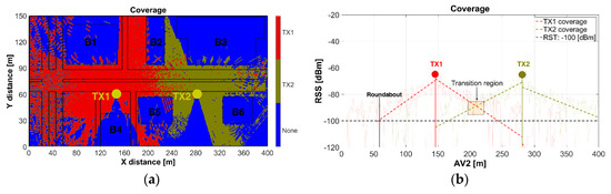 Figure 9a shows that the TX1 coverage encompasses AV1–AV2 (left-segment), ST1, ST2 (LoS) and ST3 (LoS), while the TX2 coverage embrace AV1–AV2 (right-segment). Figure 9b illustrates the AV2-RSS as function of the coverage-distance (x-axis) for each TX and, the transition region where the RX will define the point-to-point link either with TX1 or TX2, based on the sensing of the highest power received. Each TX has an approximate total coverage distance of 170m (asymmetric). The transition point is located approximately at the half distance between the TXs. The roundabout, AV3, AV4, AV5, ST2–ST3 (NLoS) is out of coverage.