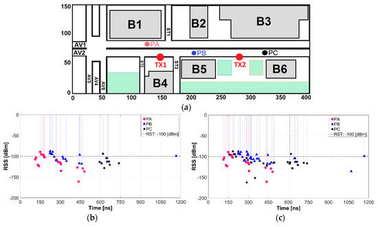 The PDP is used to calculate various multipath statistics (mean excess delay, RMS delay spread, maximum excess delay, CB) and quantifies the number and severity of power rays (echoes) in the wireless channel. Figure 5 illustrates the PDP at z-plane of 1.5 m for 3 different locations represented in Figure 10a, while Figure 10b,c depicts the PDP when TX1 or both TX1 and TX2 are transmitting. Figure 10b shows many power rays (echoes) in a time span of 0 to 1200 ns showing a high dispersive nature of this environment causing reflected, refracted, and diffracted rays that arrive to PA, PB and PC points. The highest density of rays arrives to PA which is in LoS and closest (first ray arrives at 100 ns) to TX1; conversely the lowest density is at PC, which farthest from TX1. Figure 10c illustrates the increase in the number of power rays arriving to PB and PC as a contribution effect of TX2 to the jointly PDP mainly at the transition region (refer to Figure 9b). The presence of power rays with low RSS values are mainly those reflected and diffracted by obstacles and the line of trees among AV1 and AV2.