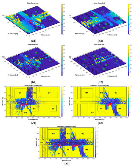Figure 11 shows the mean excess delay, RMS delay spread and CB (for frequency correlation of 0.9). Figure 11(a1,a2) depict the mean excess delay for TX1 and TX2 respectively, where higher values in the extent of distance is increased from the TX are observed, while lower values are related to low RSS due to the blocking of the propagated signal by concrete walls (signal absorption) and glass windows (signal reflection) of the buildings. The roundabout, AV3, AV4, AV5, ST3 and the rightmost segment of AV1–AV2 display the highest mean excess delay for TX1, while the leftmost segment of AV1–AV2 display this behavior for TX2.