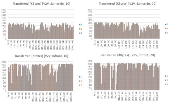 Disaggregation of the Kbytes transferred by each thread when considering a communication between vehicles (V2V) located on the same side (top) or on the opposite side (bottom) and different bandwidths (10 Mbps -left-, and 20 Mbps -right-).