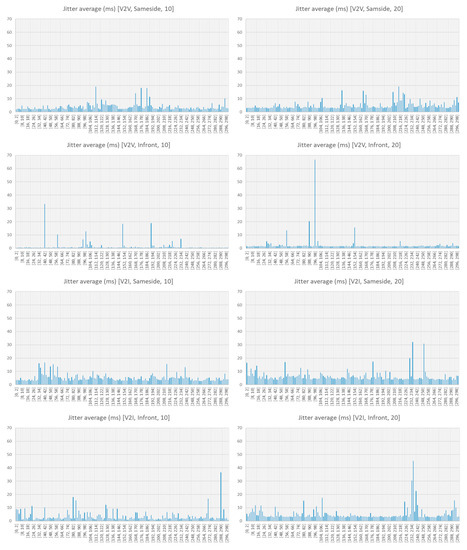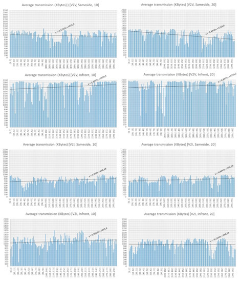 Thus, we can conclude from the observation of the measured data that communication between vehicles (V2V) located in opposite sides (called Infront in the figures) transmitting with rates not too high (10 Mbps) is preferable. V2V-Infront-10 is the operation configuration that offers better results, and therefore, the one that should be considered preferable.