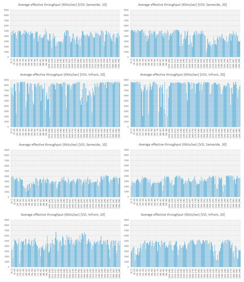 Figure 16 shows the average values of the Kbytes transferred, while Figure 17 shows the average effective throughput received. As it can be observed from Figure 16, the location on the same side of the antennas (either V2V or V2I) results in a lower data transmission rate. The best transmission results are obtained when the transceivers (V2V or V2I) are located on the opposite sides (in front). V2V communication provides an average data transmission noticeably better than V2I. However, the use of a greater bandwidth (10 and 20 Mbps) on the transmission threads does not seem to influence too much the number of bytes received. 1808 Kbytes are received on the V2V-Infront case, while 1102 Kbytes are received on the V2I-Infront case. Worst values are obtained on V2I-Sameside (741 Kbytes) and V2V-Sameside (974 Kbytes). The analysis of the effective throughput received (see Figure 17) shows a similar pattern, so we can conclude that V2V-Infront is the best configuration and V2I-Sameside provides the worst results.