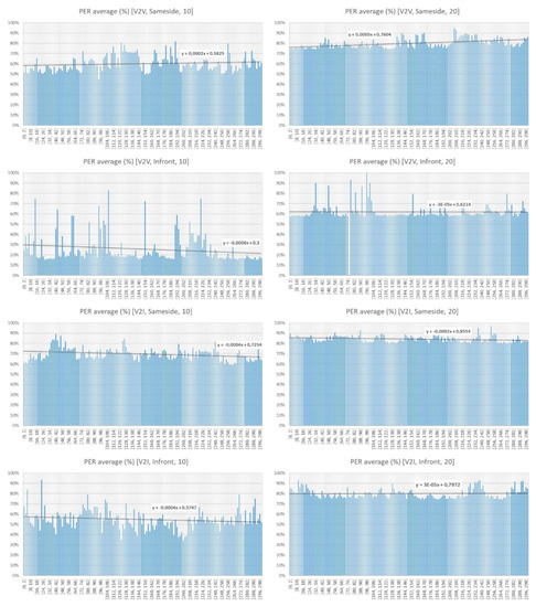 Figure 18 shows that the PER rate is clearly worse when we choose a higher bandwidth (20 Mbps) in each transmitter thread. PER average, when considering the V2I scenario, is higher, as the bandwidth required increases. This is due to the higher number of collisions observed. The PER average increases with distance. The graphs corresponding to the same side show lower PER rates than those of Infront, where vehicles are closer.