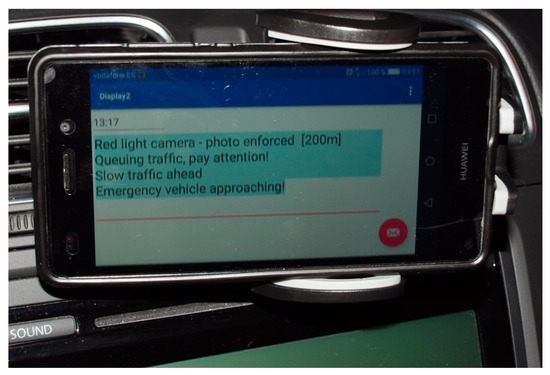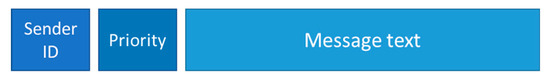 Given that this article focuses exclusively on the communication of V2V and V2I, we have simulated the traffic issues/messages to validate the correct behavior of the system. We inject in the system synthetic messages announcing the arrival of emergency vehicles, the change of traffic lights, the existence of dense traffic, the presence of a damage vehicle, and even more. Some of those messages are sent by the infrastructure (e.g., change of traffic lights) and others by the vehicles (e.g., emergency vehicles) but in both cases, a message is exchanged with the other nodes of the network. We have defined a simple packet structure (see Figure 20) that includes the sender identification (car number plate), the level of priority to establish the ordering on the presentation of the messages received and their persistence on the visualization screen, and finally, the message to be displayed. The application is responsible for not displaying repeated messages that have a previously received message identifier. The application uses the sender’s ID field, which contains a unique identifier of the sender and a counter of the messages send by this sender.