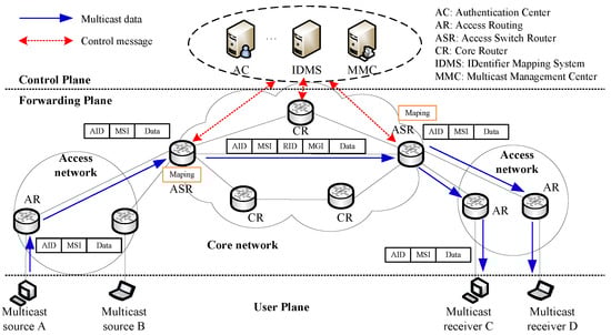 The forwarding plane consists of access network and core network. Access network is responsible for user attachment, and it uses AID to represent user device and MSI to represent multicast service, respectively. Core network is responsible for data forwarding which adopts RID to represent the data and MGI to represent multicast service, respectively. The ASR connects access network and core network, and it performs the mapping operations between AID and RID, and MSI and MGI with the assist of IDMS. The user plane consists of multicast sources and multicast receivers, which cooperates with AC to provide the multicast source and receiver authentication.