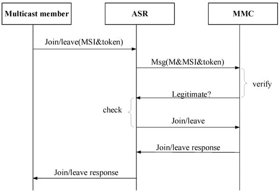 Multicast members including source and receiver are all in access networks. When a legitimate receiver wants to join a multicast group, it needs to send a join message with multicast group address (MSI) and matched token to its ASR. Then the ASR transfers this request to MMC to check if this receiver has subscribed this multicast group. If yes, the ASR then checks if there is already other group members in this access network. Only if there is no member joined such multicast group in the access network, ASR will begin to send join message with multicast address, AID and token to MMC. If it has members joined such multicast group, ASR will not send join request to MMC. Figure 5 shows the general member join/leave procedure.