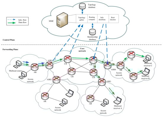 The control plane mainly consists of AC, IDMS and MMC. AC is responsible for user access authentication for multicast source and multicast receiver. IDMS is used to manage the mapping between AID and RID, and MSI and MGI. MMC is responsible for multicast membership management (registration, join and leave) and multicast routing construction. The core component of CCSM is MMC which acquires the core network topology, multicast member and related multicast service requirements, and builds the Shortest Path Tree (SPT) as multicast delivery tree for a given multicast group. As for the multicast tree, the root is selected based on the node centrality and the topology is updated in a fixed period so that SPT could always be efficient. We set a root router for a multicast group so that all sources in one group could reuse the SPT. MMC updates the multicast delivery tree in a central way and distributes the multicast routing table into ASR and CR.