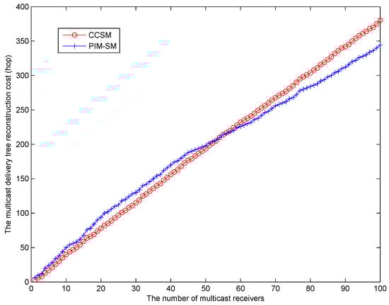 Figure 9 shows the reconstruction cost of CCSM and PIM-SM. During this simulation, we randomly select a node as multicast receiver to join the group, and we perform the CCSM multicast reconstruction procedure and PIM-SM graft procedure, respectively. We can find that when the number of multicast receiver is small, to be more specific, less than 54, the reconstruction cost of CCSM is lower than PIM-SM. When the number of receivers is greater than 54, the reconstruction cost of PIM-SM is smaller than CCSM. This is because that with the increase of multicast receivers, the PIM-SM graft procedure will have a high probability to encounter the existing multicast delivery tree, while as for CCSM, all the reconstruction has been initiated by MMC and MMC distributes the multicast routing entries to ASR or CR to update the multicast delivery tree. Therefore, the reconstruction procedure cannot benefit from the existing multicast delivery tree. This result also shows that comparing with PIM-SM, the CCSM is more effective when the multicast receiver density is small.