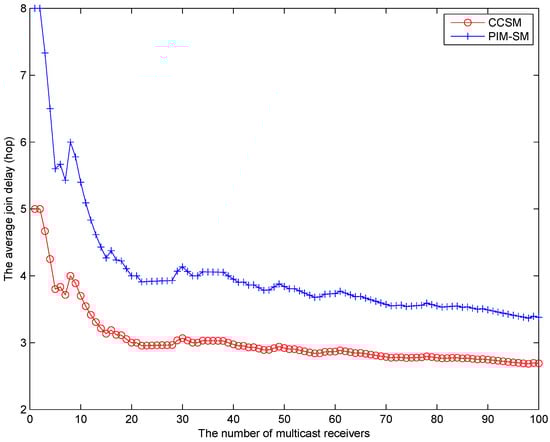 Figure 10 shows the average multicast receiver join delay of CCSM and PIM-SM. We simulate multicast join procedure by randomly selecting a new node as the multicast receiver. When a new multicast receiver joins the group, the multicast delivery tree will be reconstructed. Once the multicast delivery tree finished the update, the new multicast receiver will get the multicast packets. We calculate the average distance of all multicast receivers to get the multicast packets. From Figure 10, we can find that the average join delay of CCSM is lower than PIM-SM although CCSM will take more cost to rebuild the multicast tree when the multicast receiver density is large. The reason is that CCSM adopts the centralized computation method which can set up a global optimal multicast delivery tree for all receivers. On the contrary, PIM-SM adopts the graft method which can only get the local optimal multicast delivery tree. Therefore, the average join delay of CCSM is better than PIM-SM.