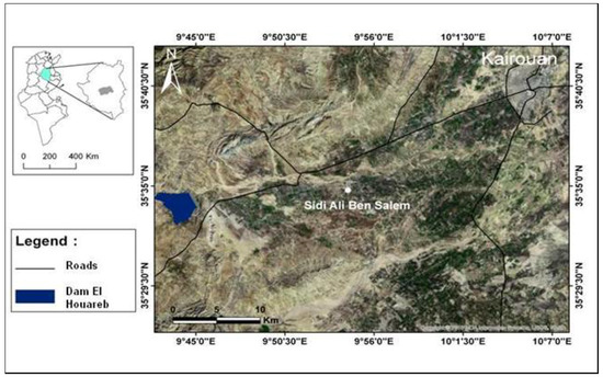 The region of Kairouan is located in the eastern zone of the Tunisian Atlas, between central Tunisia and eastern Tunisia: latitude 9°30′ E–10°15′ E and longitude 35° N–35°45′ N (Figure 1). This area is characterized by a semi-arid climate. In central Tunisia, the rainy season extends from October to May, in summer, rain is almost absent. In the Kairouan region, the average annual rainfall is 400 mm per year on the heights and 300 mm per year in the plain [18]. The evapotranspiration (Penman) in this region is close to 1600 mm.
