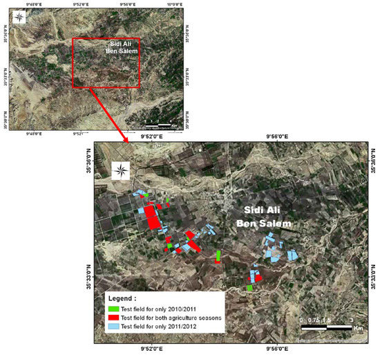 For North Africa, farms are for the most part small plots, due to inheritance processes that have favored the fragmentation of land [20]. Consequently, the study of agricultural surfaces by remote sensing requires the use of satellite images with a high spatial resolution such us SPOT Image (spatial resolution is equal to 10 m). Fifteen images acquired by the SPOT 5 and SPOT4 satellites were analyzed (Table 1).