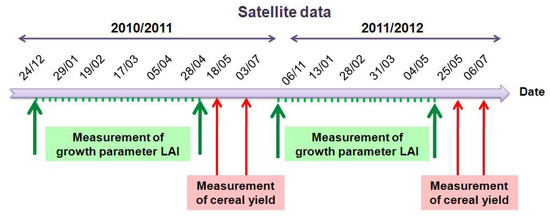 In order to be sure of the quality of statistical analysis, only fields with more than one hectare were considered in this selection. The in situ measurements included mainly: water content, crop height, Leaf Area Index (LAI) of the vegetation, and cereal yield at the end of the season. In Figure 3, we present an overview of the satellite and ground measurements during the two agricultural years.