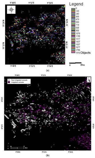 (a) Segmented image produced for the 2010/2011 agricultural season; (b) Land-use map of irrigated and non-irrigated cereals for the 2010/2011 agricultural season.