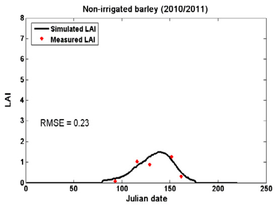 In a second step, the approach described above was applied to the case of two different cereals: wheat and barley, as shown in Figure 9. The measured and estimated yields are found to be well correlated (R2 = 0.63 for wheat, and R2 = 0.77 for barley), with (RMSE) errors equal to 7.95 and 5.37 quintals/ha for wheat and barley, respectively.