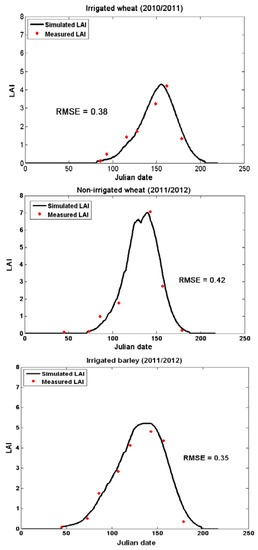 These parameters are calibrated using an optimization algorithm based on the comparison between in situ values of LAI observed in the fields and those estimated with the SAFY model [13].