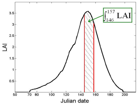 The grain yield is thus expressed as a function of LAI, during the cereal development period between 25 March and 5 April, which corresponds to the range between the 146th and 157th Julian Days. We note this parameter ALAI (Figure 7). In the initial SAFY model, the yield is expressed as a function of the total dry aerial phytomass (including, among others, the maximum LAI). Application of the SAFY model to the study of the Kairouan plain raised various questions concerning the model’s limitations in terms of yield estimation. It was thus proposed to improve these estimations by including the LAI integral (ALAI) in the grain yield calculation. Since the SAFY model accurately extracts the variation of LAI along the vegetative cycle, the estimation of ALAI will be established by this model for each plot (segment). Consequently, the phenological development and the sowing date (D0) were taken into consideration: