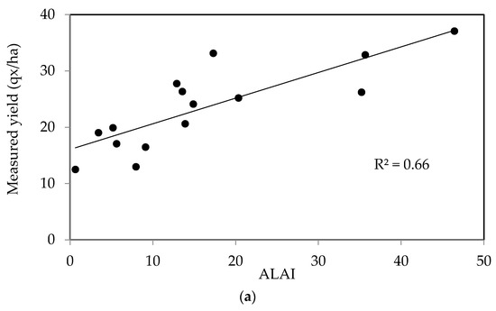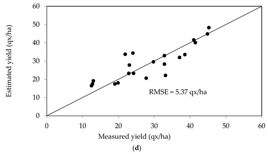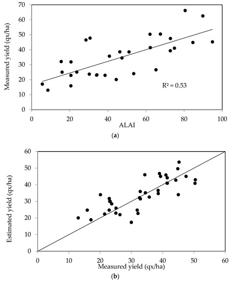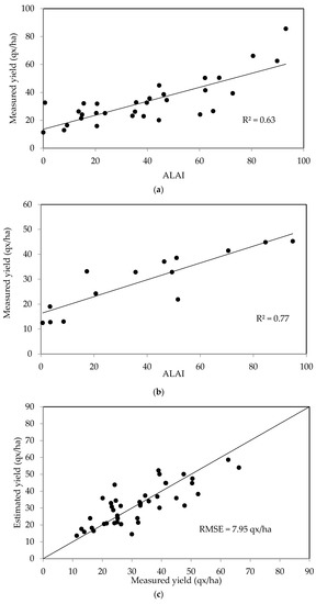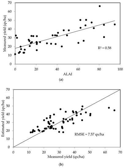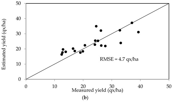 Figure 8b shows a plot of the measured yields as a function of the values estimated using the maximum LAI area for the second data set. These two parameters are found to be well correlated, with the RMSE equal to 7.57 quintals/ha.