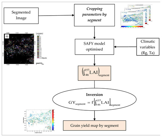The spatialisation grain-yield technique is explained in the following organigram (Figure 12). In this section of the study, a distinct inversion was computed for each segment (or plot). This approach is the same as that adopted by [13]. Following calibration of the SAFY model, through the use of multi-temporal LAI satellite maps and LAI values computed for the maximum growth period, yield estimations are proposed for the entire studied site.