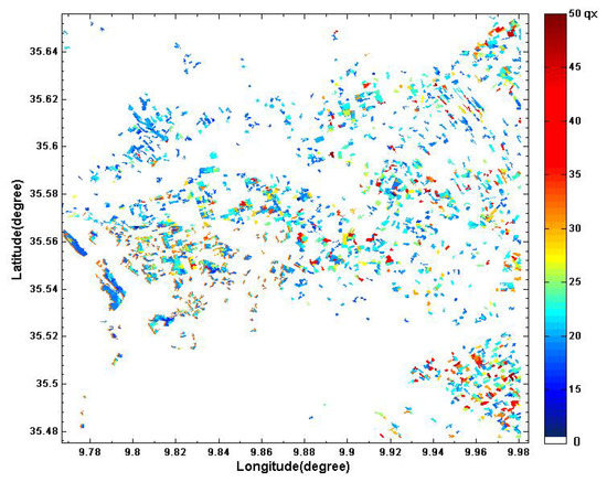 The LAI is defined as the total one-sided area of leaf tissue per unit of ground surface area. According to this definition, the LAI is a dimensionless quantity characterizing the canopy of an ecosystem. The LAI measurements were made on all test plots during different stages of vegetative development of the cereals, with a repeatability of two to three weeks during the agricultural season between December and April. In this study, hemispherical digital photography was used to measure the LAI. Thirty LAI estimations were made in two 20 × 20 m square zones inside each field. The LAI was derived from hemispherical digital photography based on analysis of the canopy gap fraction [16]. The proposed approach was validated by destructive measurement campaign carried out in the past over the studied site [13]. Despite the good agreement between the two approaches, a decrease in accuracy exists for non-destructive approaches for dense vegetation covers.