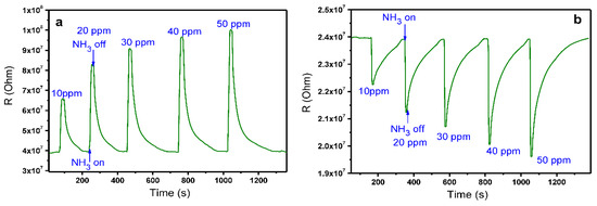The sensor response of MPcFx (M = Cu, Co, Zn; x = 4, 16) films was studied by a chemiresistive method. The choice of phthalocyanines of copper, cobalt, and zinc was determined by their better sensitivity to ammonia, according to the experimental data and DFT calculations performed earlier by Liang et al. [33]. The change of the film resistance during the sequential injection of the gas analyte and air purging was measured. The typical sensor response toward ammonia is shown in Figure 1, using CoPcF4 and CoPcF16 (b) films as an example.