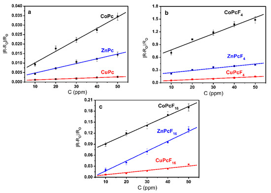 Dependence of the relative sensor response |R-Ro|/Ro on NH3 concentration (10–50 ppm) for MPc (a); MPcF4 (b), and MPcF16 (c) (M = Zn, Co, Cu) films.