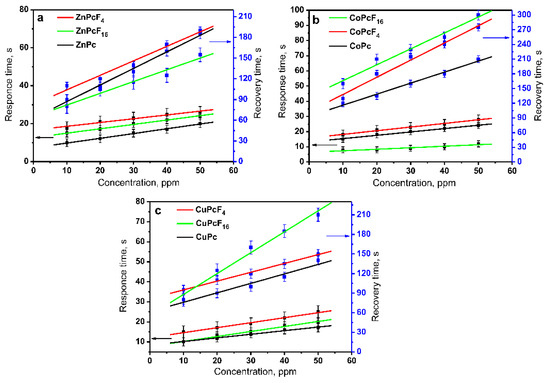Dependence of the response and recovery times on NH3 concentration (10–50 ppm) for ZnPcFx (a), CoPcFx (b), and CuPcFx (c) (x = 0, 4, 16) films.