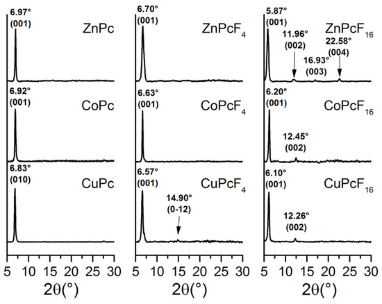 XRD patterns for thin film samples of MPcFx (M = Zn, Co, Cu; x = 0, 4, 16).