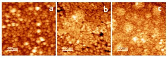 Figure 6 shows the AFM images of the surface of the ZnPc (a), ZnPcF4 (b), and ZnPcF16 (c) films. As can be clearly seen, the ZnPc films surface consists of roundish grains (Figure 6a) and has the rms roughness value of 14.2 nm. The ZnPcF4 film, having an rms roughness of 6.7 nm, is formed by azimuthally disordered elongated grains (Figure 6b). The ZnPcF16 films exhibit a high density of azimuthally disordered roundish grains, with the size noticeably smaller than those of the ZnPc films and the minimal rms roughness values (4.2 nm) among the investigated films (Figure 6c). The more rough and inhomogeneous surface of the ZnPcF4 films can also be responsible for their higher sensor response to ammonia, compared with ZnPcF16 films.