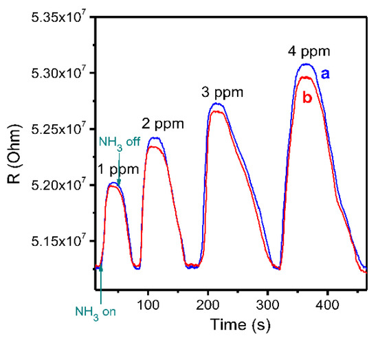 Sensor response of a ZnPcF4 layer toward ammonia in the concentration range from 1 to 4 ppm, in air (a) and in a mixture of gases with the composition close to exhaled air of healthy people (N2—76%, O2—16%, H2O—5%, and CO2—3%) (b).