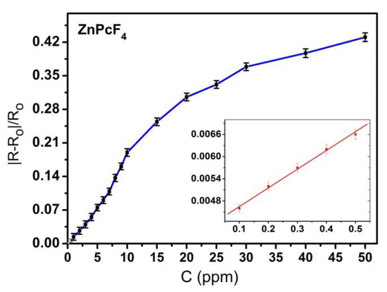 Dependence of the sensor response of ZnPcF4 films on NH3 concentration (0.1–50 ppm).