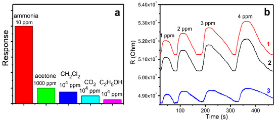 (a) Response of a ZnPcF4 film to ammonia (10 ppm), acetone (1000 ppm), dichloromethane (104 ppm), carbon dioxide (104 ppm), and ethanol (104 ppm); (b) Response of a ZnPcF4 film to ammonia (1–4 ppm) in air measured at relative humidity of 5% (1), 30% (2), and 70% (3).