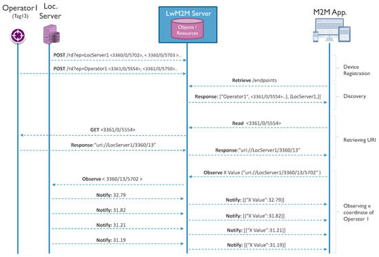 In this interaction model, the target device is calculating its own position, and it can directly expose any measured data via the proposed position object model (3360) in case the technology is not GPS. Any device interested in this information can directly interact with the tag device and read any relevant location information after the resource discovery. If the device exposes multiple location data with different technologies, then the application can reach the data via different position instances (3360/0, 3360/1, 3360/2, etc.), and it can also read the ‘application type’ or ‘server URI’ resources to find out the corresponding localization system. In order to track target objects, the application server can send an observe request to the target tag and receive notifications whenever the tag calculates a new position. Besides the data delivery and monitoring, the LwM2M device management interfaces can also be used to configure the tags with the necessary information (e.g., position of anchors) in order to calculate their own positions. Again, with uniform data models, such an interface can offer a generic solution for the tag configuration; however, this is not in the scope of this paper.