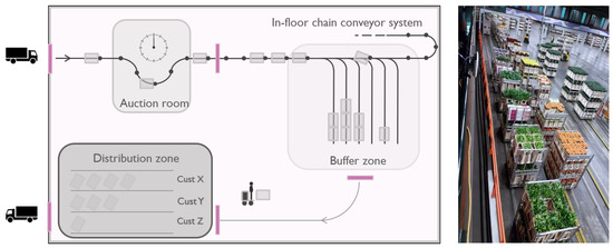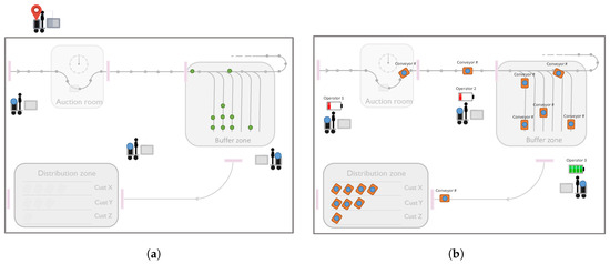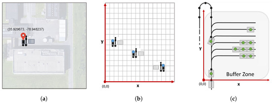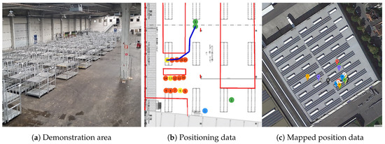 The designed interconnected system and products are installed in a real flower auction warehouse, namely Euroveiling Flower Auction Center in Brussels, Belgium, and we demonstrated the interoperation functionalities with real warehouse scenarios, which include various zones and areas with different purposes, features or characteristics that mandate different localization requirements. The demonstration area is provided in Figure 10a, and two screenshots from location-aware warehouse operations are provided in Figure 10b,c, which includes position data from different technologies and devices. In Figure 10b, green circles represent the operators, blue shows the connected conveyor cart, red ones are transport trolleys and yellow circles are again transport trolleys, which require an action from the operators. Furthermore, the blue line is the calculated route for Operator 2 to navigate him to the next task (Trolley 19). Finally, Figure 10c represents the translated/mapped position data to GPS coordinates based on the reference point resources exposed by each localization technology on the top demonstration building.