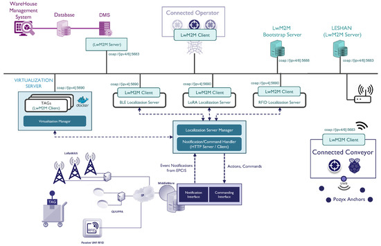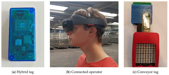 Regarding other members of this ecosystem, we used a newly-developed hybrid tag prototype, illustrated in Figure 9a (for more information, refer to [29]), in order to monitor the transport trolleys, with tag attached, during warehouse operations. As is illustrated in Figure 7, to overcome the integration of these hybrid tags, which cannot support LwM2M connectivity, we introduced the idea of device virtualization where we create LwM2M-compliant APIs. These virtualized devices are realized as Docker containers, which can be easily deployed on any operation system. Inside these containers, there are Anjay LwM2M clients running and exposing device- and location-related resources, which are received from a proprietary notification server and exposed to the LwM2M world. Similarly, for the localization servers (infrastructure backend localization systems), we deployed Lwm2M clients for each technology, which also receive the location data from the same notification server and expose it as LwM2M resources (3360). For the connected operator, an operator interface is developed by means of a tablet and, alternatively, virtual reality glasses, as presented in Figure 9b (for more information, refer to [28]), which enables an operator to dynamically monitor and react to tasks, monitor and interact with other connected products. Finally, for connected conveyors, we developed a prototype, presented in Figure 9c, which can be used to track pallets and carts in an accurate way, by means of an attached Pozyx tag, and provide virtual commands and messages via an attached LED matrix. Within this integrated ecosystem, all of the applications (location, light, text display, etc.) and management (device, server, etc.) traffic is modeled and realized by means of LwM2M interconnectivity.