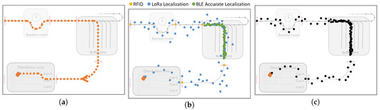 We considered a scenario where a trolley is entering the warehouse and moves across the auction room, buffer zone and finally the distribution zone, with the resulting trajectory shown in Figure 11a. During this process, the trolley is being localized by all localization technologies, and these localization measurements are provided in Figure 11b. As this figure presents, the BLE-based localization measurements are only available in the buffer zone, while LoRa measurements are obtained for the whole warehouse, including the buffer zone. In the buffer zone, where trolleys are tracked by more than one localization technology, the cooperation of multiple localization technologies can improve location accuracy. In such a scenario, these localization technologies can cooperate and exchange data in order to improve location accuracy, overcome temporary failures or omit incorrect location data. Algorithm 1 roughly provides a simple algorithm, which can be used to combine the measurements of various localization technologies. The filtered and post-processed location data are provided in Figure 11c.