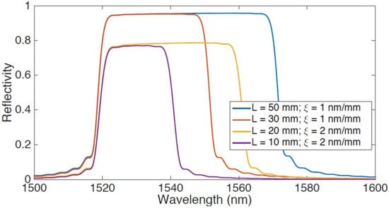 The CMT-based FBG-cascade model for the CFBG is shown in Figure 2, where the reflection spectrum of a CFBG is shown for different grating profiles. The chart shows the spectrum simulated for different CFBG, all having different length L and chirp rate ξ, the same discretization step Lg = 0.2 mm, and the same grating parameters (kLg = 0.4, neff = 1.5, δneff = 10−6, λB(0) = 1520 nm). It can be shown that the CFBG appears as a flat spectrum, covering a bandwidth equal to the product L × ξ, and having a reflectivity that depends on the chirp rate. The CFBG used in applications such as [36,38,49,53] have bandwidth that can exceed 10 nm, similar to the spectra in Figure 2; in other applications where the chirp rate is limited by the FBG inscription setup [39], the CFBG has a narrower bandwidth limited to few nanometers.