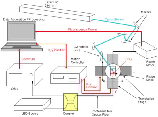 The setup for inscription allows scanning the whole grating length longitudinally. The setup in Figure 4 is based on a 244-nm UV laser, while other setups can use an Ar-ion laser [40], an excimer laser [63], or a KrF laser. After an optical path based on a beam expander and a collimator, the laser is focused on the phase mask, mounted on a xy-translation stage in order to scan all the grating length. The phase mask is mounted on top of the stripped fiber that hosts the FBG. The motion controller is set to scan the grating length longitudinally and compensating for eventual misalignments; this can be checked by monitoring the fluorescence power emitted from the fiber with a power meter [6]. During the inscription, the spectrum of the FBG is monitored with a white light setup, that in Figure 4 is an amplified spontaneous emission (ASE) connected to an optical spectrum analyzer (OSA).