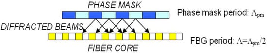 A setup for inscription of Bragg gratings based on a phase mask is shown in Figure 4, sketching the process used in [64]. The phase mask inscription exploits the photosensitivity of optical fibers [56], which determines the change of refractive index of the optical fiber core when exposed to an intense UV or KrF light. The phase mask is a diffractive element, usually fabricated with photolithography [2,6], that implements the refractive index modulation as sketched in Figure 5. When exposed to UV light, the phase mask cancels the 0-th order of diffraction, while having large diffractive energy for the ±1st orders of diffraction.
