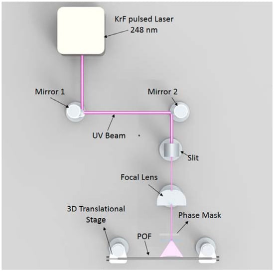 Among the several setups designed for POF FBGs, the KrF-based setup described by Marques et al. [70] allows a high efficiency and a short inscription time; the setup is sketched in Figure 6 (image from [70]). The laser is a KrF excimer laser at 248 nm emission wavelength, with 15 ns pulse duration. The system routes the pulsed light through an air path, and focalizes on a POF fibers mounted on a 3-dimensional translational stage, with the phase mask laying on the exposed fiber. The reported results shown an inscription time of 14–25 s depending on grating length and fiber compound.